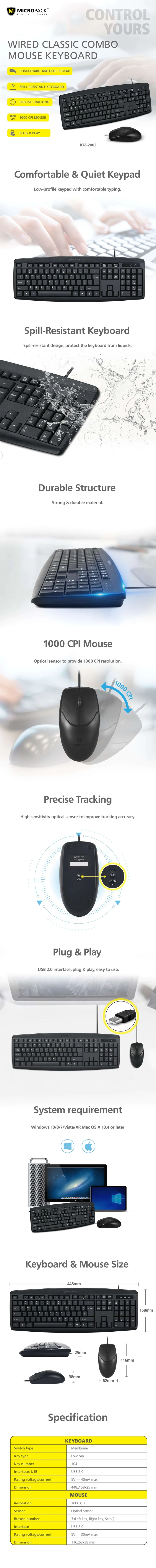 | Mouse | Resolution: 1000 DPI Sensor: Optical sensor Button Number: 3 (Left key, right key, scroll) Interface: USB 2.0 Dimension: 116x62x38 mm |